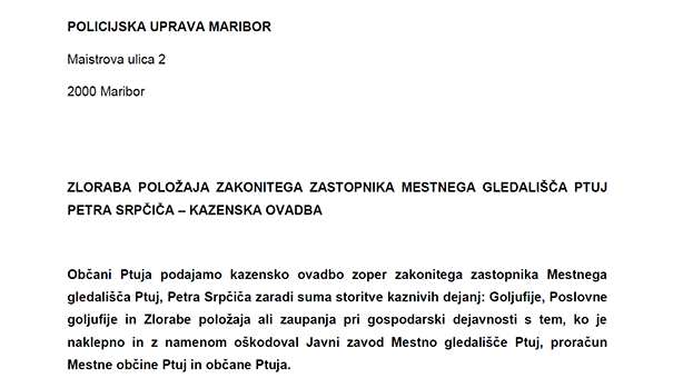 Kazensko ovadbo zoper direktorja MGP Petra Srpčiča so podpisali anonimni občani Ptuja.