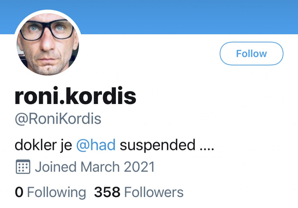 Še vedno pa na twitterju ostaja suspendiran Roni Kordiš @Had (spomnimo, kaj vse je že ta Roni Kordiš: tukaj), ki so ga na twitterju blokirali že v začetku marca in se zdaj na tem družbenem omrežju pojavlja pod novim rezervnim profilom @RoniKordis, vendar z bistveno manjšim dosegom oziroma zelo majhnim številom sledilcev (Požareport):
