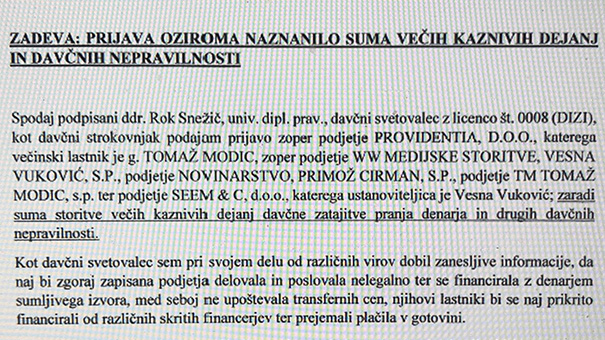 Davčni svetovalec Rok Snežič, zlasti utajevalec davkov in predvsem kriminalec. Bodite dosledni, ko nam predstavljate premierovo družbo z jaht in rajskih otokov, zapora na Dobu in še nekaterih prestižnih turističnih destinacij. Zdaj ima pravega človeka na Fursu in nam bo, iz gnilega in bolnega Balkana izgnani, lahko pokazali svoj pravi obraz domoljubja, iskrenosti in sobivanja na pravi strani zakonov. Pričakujem, da bo barabin tudi bral ustavo pred parlamentom. Prisluhnil mu bom. No, najprej naj vse, kar je utajil in ukradel prinese nazaj. Potem naj bebec ovaja druge in odvaja od zasvojenosti s kriminalom. Najprej svojega dobrega prijatelja .