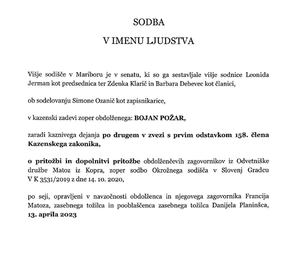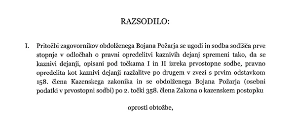 Če smo 7. marca poročali o tem, kako je vrhovno sodišče razveljavilo edino obsodilno sodbo zoper Bojana Požarja (vir), ki jo je, v zadevi "Arsenovič-Štandeker", izreklo okrožno sodišče v Slovenj Gradcu (oktobra 2020), potrdilo pa višje sodišče v Mariboru (julija 2021), lahko danes še toliko bolj zadovoljno zapišemo, da je Bojan Požar - tudi - v tej sodni zadevi, po skoraj petih letih sodnih bojev (in izgubljenega časa, pri čemer so potrebni še jekleni živci in vrhunski odvetnik), dokončno pravnomočno oproščen.
