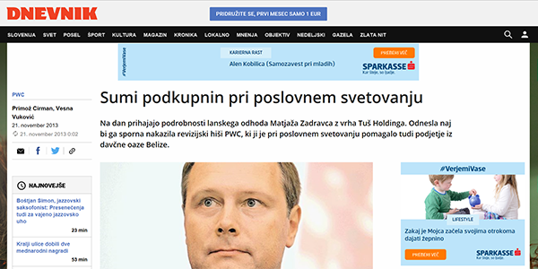 - Bil je tudi član uprave Gorenja iz Velenja in vodstva nemške družbe Bertelsmann, obe veliki mednarodni svetovalno-revizijski družbi, AT Kearney in Pricewaterhouse Coopers (PWC), pa je menda moral zapustiti zaradi poslov, ki jih je dajal svojim zasebnim partnericam, danes pa je z najnovejšo soprogo Sonjo Vizjak lastnik družbe AV Consulting na Dunaju. Vizjak, ki se je zapletel tudi v sporne posle in sume podkupnin s Tušem, plačanih skozi karibsko davčno oazo Belize, o čemer sta novembra 2013 za časopis Dnevnik poročala novinarja Primož Cirman in Vesna Vuković, ki danes - neverjetno, kako je svet majhen - delata prav za Telekomov spletni portal Siol.net: