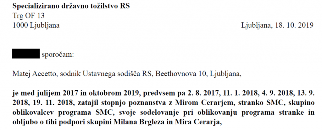 Ko moralno in intelektualno identiteto in avtoriteto izgubi najvišja sodna oblast v državi, to je Ustavno sodišče, je znak za alarm najvišje stopnje. Predsednik države, kot najvišji varuh demokratične ureditve je dolžan intervenirati. Zato ga pozivam, da se opredeli in zavzame svoje stališče. Gre za odnos sodnikov do problema nepristranskosti, ki je temeljni pogoj za pošteno sojenje in odločanje. Na Ustavno sodišče zato vlagam poziv k odstopu 3 sodnikov, ki so okrnili ugled Ustavnega sodišča. Edini način, da se ohrani avtoriteta najvišje sodne ustanove v državi je odstop 3 dokazano kontaminiranih ustavnih sodnikov. To so sodniki iz kvote nekdanje poslanke SMC Jasne Murgel, ko je ta leta 2017 pred vso slovensko javnostjo v Državnem zboru grozila z napovedjo takšne zasedbe Ustavnega sodišča, ki bo po meri oblastne večine. Ker se zdaj dogaja prav to, zahtevamo odstop kontaminiranih in nezakonito postavljenih sodnikov: 1. Dr. Mateja Acceta 2. dr. Špelce Mežnar 3. dr. Rajka Kneza, katerih moralna in poklicna avtoriteta je tako okrnjena, da ruši ugled Ustavnega sodišča.
