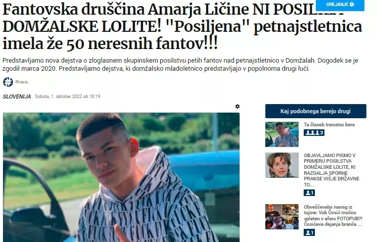 V našem mediju smo eni redkih v Sloveniji, ki smo si upali v razvpitem domnevnem posilstvu peterice domžalskih fantov nad takratno petnajstletnico iz okolice Domžal postaviti na njihovo stran. Fante lahko kritiziramo, kaj so sploh premišljevali, da so se takrat spustili v spolne odnose s domžalsko Lolito, kot smo jo poimenovali. Vendar smo dokazali že lani, da domnevna žrtev posilstva niti malo ni tako spolno nedolžna, kot se predstavlja v večinski slovenski javnosti. Sedaj se je ugotovilo, da je svoje spolne usluge ponujala peterici sama in hotela dobiti plačilo za spolne usluge. Še več, sama si je želela tri mesece po dogodku novo spolno avanturo s osrednjim osumljencem Amarjem Ličino, a je ta takrat imel že drugo prijateljico. Lolita pa je svojega domnevnega posiljevalca po dogodku povabila tudi na eno zabavo. Zdaj pa vprašanje za milijon dolarjev. Vprašajte se, ali bi vi kot žrtev posilstva še hoteli imeti stike in spolne odnose s svojim domnevnim posiljevalcem? Spoštovani, sodnica Urška Zorko in tožilka Tamara Gregorčič, kdaj bosta prekinili to sodno farso in dopustili, da bo sodni proces potekal pravično za vse udeležence. Če si tega nista sami pripravljeni priznati, prosim poglejta si profil Reality-Borimo se za pravico na Tiktoku in bosta ugotovili, da res izvajata sodno farso.