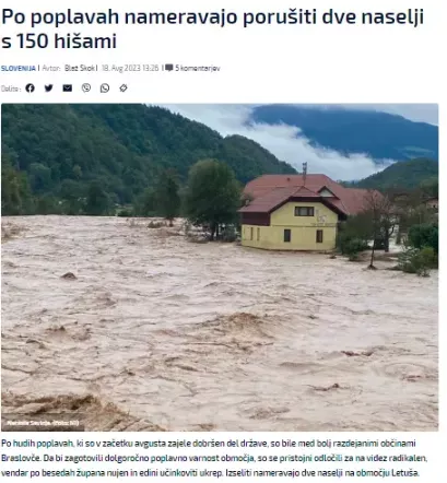 Evo jih. https://teletext.rtvslo.si/ttxdata/114_0001.png?21.11.2023 16:11:42 Evo Gmajno bodo rušil. Bluzijo zakaj ste pa gradili tam? Zaradi nasipa, ki naj bi preprečeval poplave. Da ni bilo nasipa ne bi nobem gradil tam ali kupval zemljišča. Torej kam je poniknilo 5,4 miljona evrov leta 2018? Zakaj to pogrevam? Jebiga. Evri so bili namenjeni za proti poplavne ukrepe. Kdo bo telovaje pripeljal pred roko pravice? Ne obstaja kaj takega. Zdaj bi pa sesuval gmajnarje.