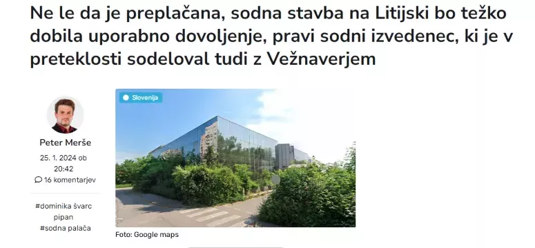 A vse kaže, kot je razkril prispevek v zadnji Tarči in članek v Domovini z naslovom Ne le da je preplačana, sodna stavba na Litijski bo težko dobila uporabno dovoljenje, pravi sodni izvedenec, ki je v preteklosti sodeloval tudi z Vežnaverjem da bo prenova stavbe stala najmanj med 7 in 10 milijonov evrov. Poleg tega je problem še z kulturno dediščino, saj je nekdanje poslovna stavba propadlega podjetja Hermes velja za prvo zgrajeno stekleno stavbo v Sloveniji. V članku pa Bojan Tomc, nekdanji dolgeletni predsednik Združenje sodnih izvedencev in sodnih cenilcev gradbene stroke (SICRASS) za področje širše Južne Primorske do Postojne razkril, da je z Vežanavarjem v preteklosti tudi poslovno sodeloval.