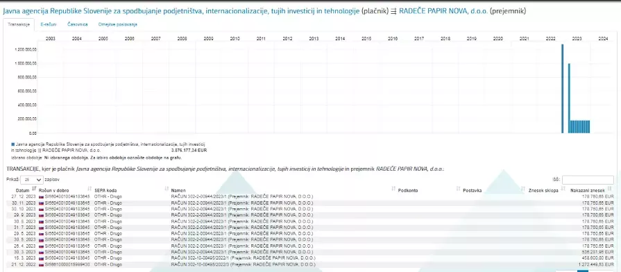 Zakaj smo sploh izpostavili podjetje Radeče papir Nova? Nekdo nas je opozoril na zelo zanimiv podatek, ki se je pojavil v aplikaciji ERAR. Tako se lahko opazi, da je Javna agencija Republike Slovenije za spodbujanje podjetništva, internacionalizacije, tujih investicij in tehnologije (SPIRIT) od dne 21. decembra 2022 do 27. decembra 2023 prejeli 3.876.177,34 EUR!