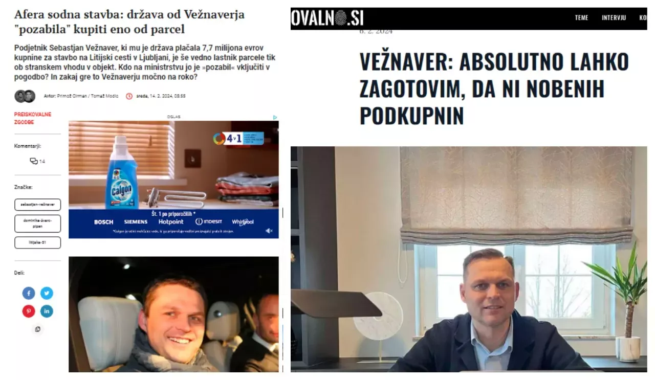 Eni Vežnaverja kritizirajo v Odlazkovih medijih in ga uvrščajo v osrčje afere Litijska (Necenzurirano), drugi Odlazkov medij Preiskovalno pa celotno afero Litijska "brani" Sebastjana Vežnaverja. (Foto: Necenzurirano in Preiskovalno).