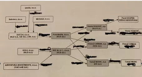 Shema, kako je potekal tok denarja iz družb Svet24, Gen-i in Adventura Investments v družbi Providentia in SEE M &C, ki so jo obvladovali nekdanji člani novinarske trojke Primož Cirman, Vesna Vukovič in Tomaž Modic. (Foto: Prava.si)