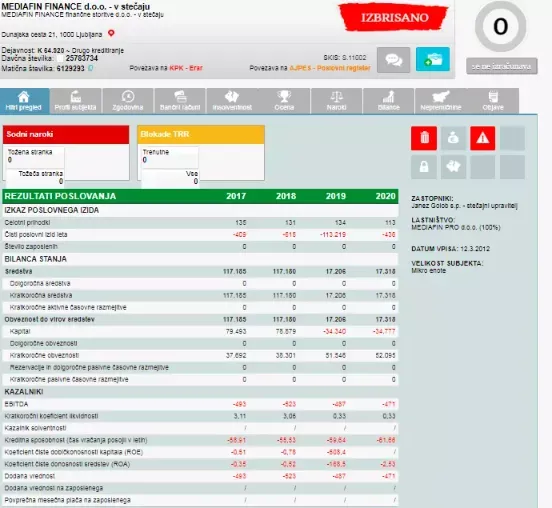 "Po merilih ZFPPIPP je nastopila domneva insolventnosti zaradi dolgoročne plačilne nesposobnosti po kriteriju negativnega kapitala (1. tč. III. odst. 14. čl. ZFPPIPP). Po zadnji bilanci subjekt posluje z izgubo.