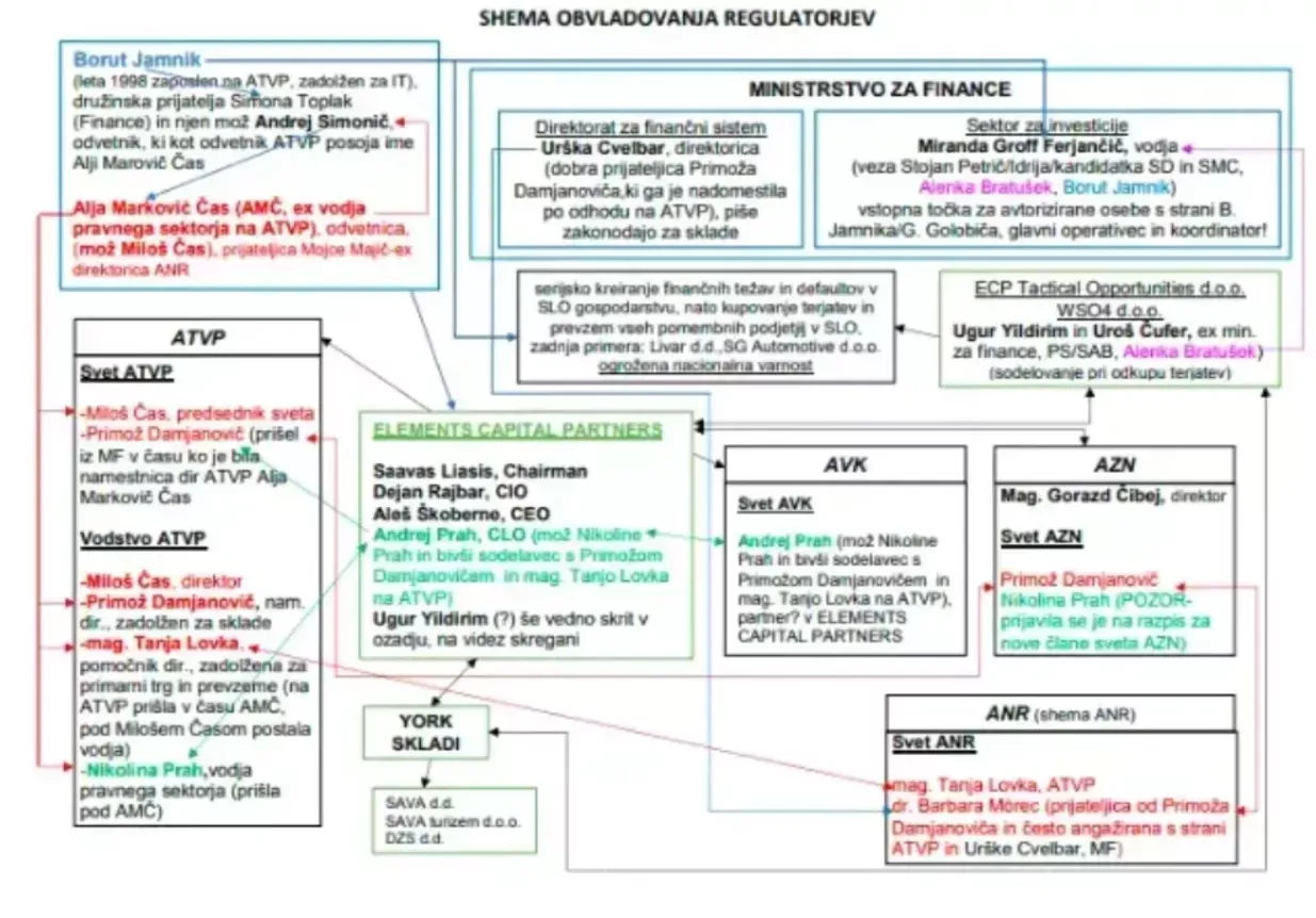 Shema, kako so akterji blizu sedanjega predsednika SID banke in nekdanjega dolgoletnega predsednika Modre zavarovalnice Boruta Jamnika prevzeli ključne pozicije v "neodvisnih regulatorjih." Ena izmed njih je bila tudi Alja Markovič Čas. (Foto: bralec Prava.si)