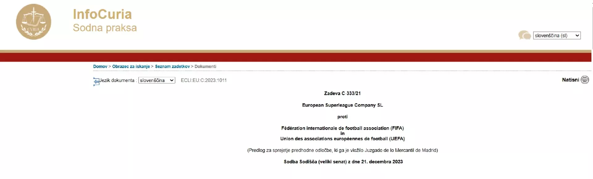 Sodba Sodišča Evropske Unije z dne 18.1. 2023 v zadevi C-333/ 21 (zadeva Superliga). (Foto: Posnetek zaslona- Curia dokumenti)