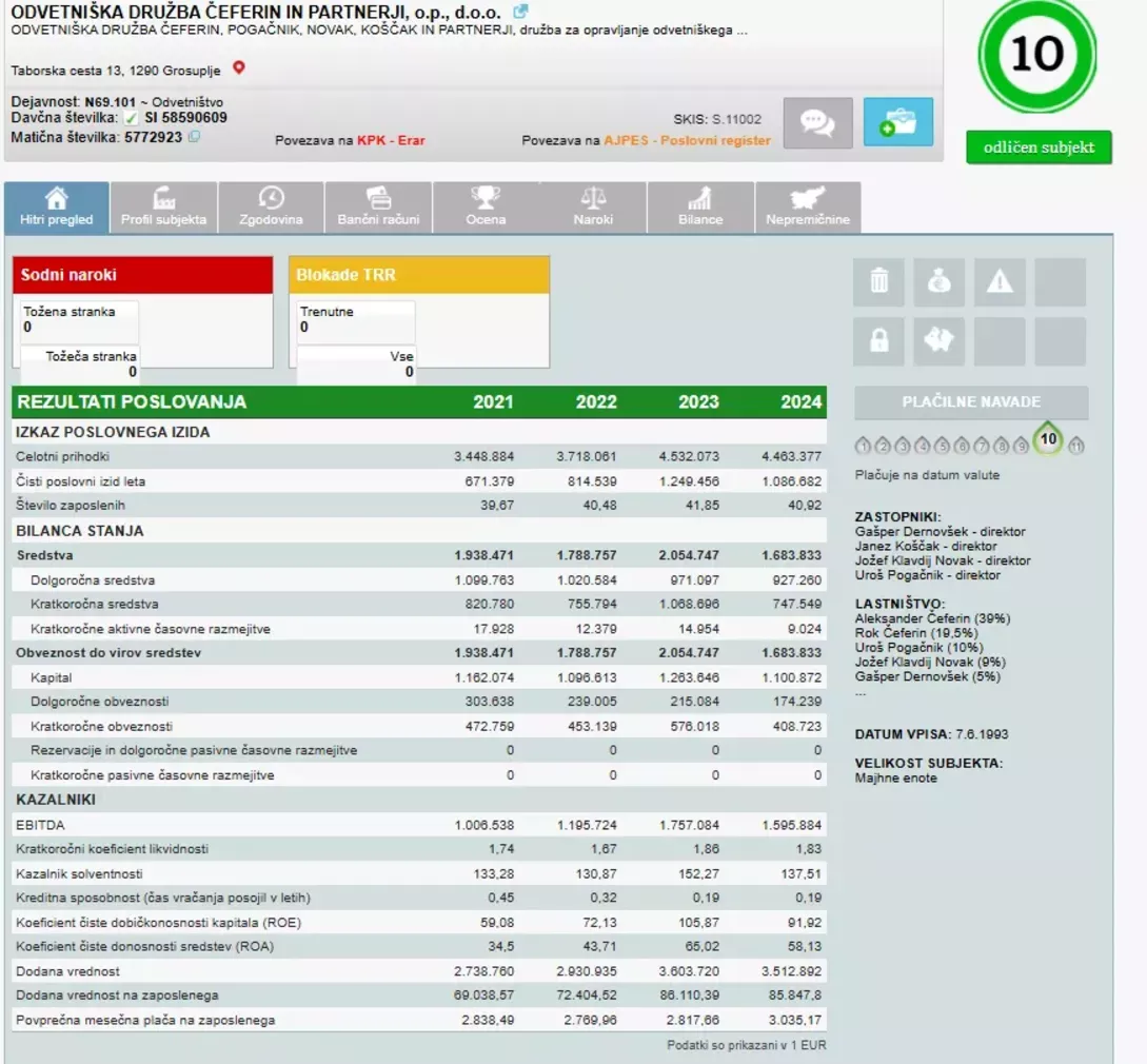 Poslovni izkazi odvetniške pisarne Čeferin v letih 2021-2024. (Foto: Posnetek zaslona- E-bonitete)