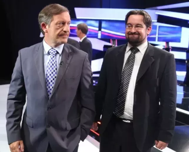 Robert Kojc kot predstavnik nekdanje stranke Alenke Bratušek, zdaj Gibanje Svoboda s Karlom Erjavcem na soočenju za parlamentarne volitve v letu 2014. (Foto: Posnetek zaslona-24ur, Damjan Žibert)