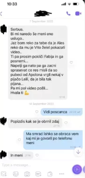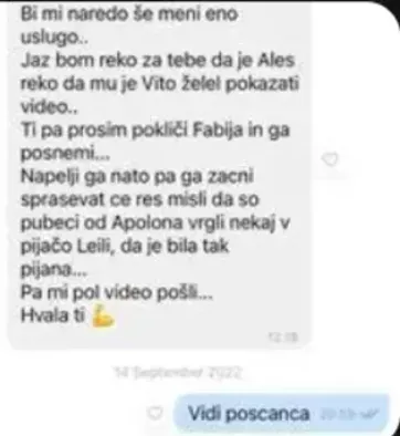 "Serbus. Bi mi naredo še meni eno uslugo? Jaz bom reko za tebe, da je Aleš rekel, da mu je Vito želel pokazati video. Ti pa prosim pokliči Fabija in ga posnemi. Napelji ga, nato pa ga začni spraševati, če res misli, da so punci od Apolona vrgli nekaj v pijačo L., da je bila tak pijana. Pa mi potem video pošli. Hvala ti." Sporočilo je bilo poslano 7. septembra 2022 ob 12:18 uri.