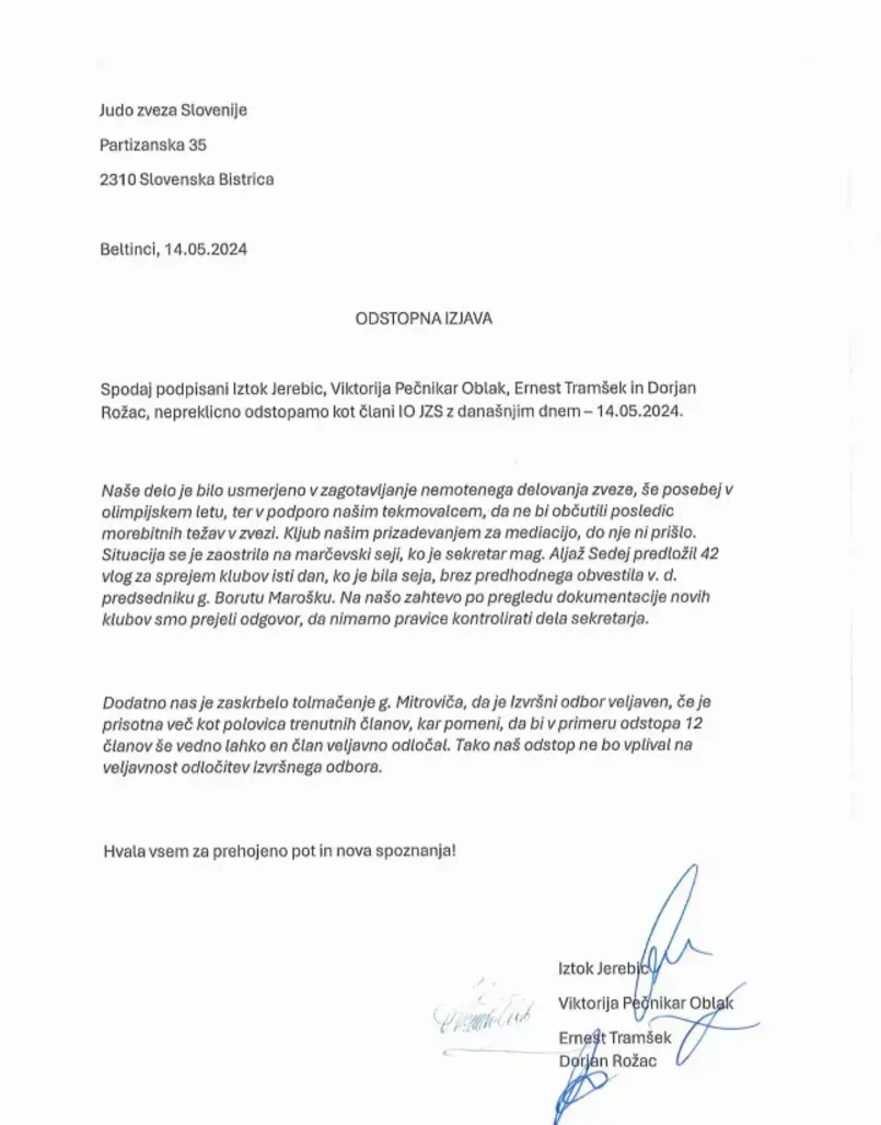 Odstopna izjava treh članov IO JZS. (Foto: Bralec Prava.si)