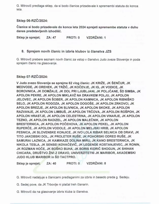 Preko noči sta sekretar Sedej in odvetnik Mitrovič pregledala 42 novih klubov. Vloge za te klube nikoli niso bile poslane na uraden e-poštni naslov JZS. Klubi Jenuša in njegove skupine (Vuzem, Jereb, Železnikar) so bili naslednji dan potrjeni in sprejeti v JZS, tudi s strani nekaterih članov IO JZS, ki so hkrati tudi člani omenjene skupine. Sprejemali so in potrjevali sami sebe. Zaradi vsega tega dogajanja so odstopili štirje pošteni člani IO JZS, ki so že dali izjave in bodo po potrebi tudi pričali za vas. Ko boste prebrali zapisnik obravnave pred sodiščem v Slovenski Bistrici, vam bo zadeva povsem jasna, pa tudi razlogi, zakaj ti mojstri ne bodo nikogar tožili.