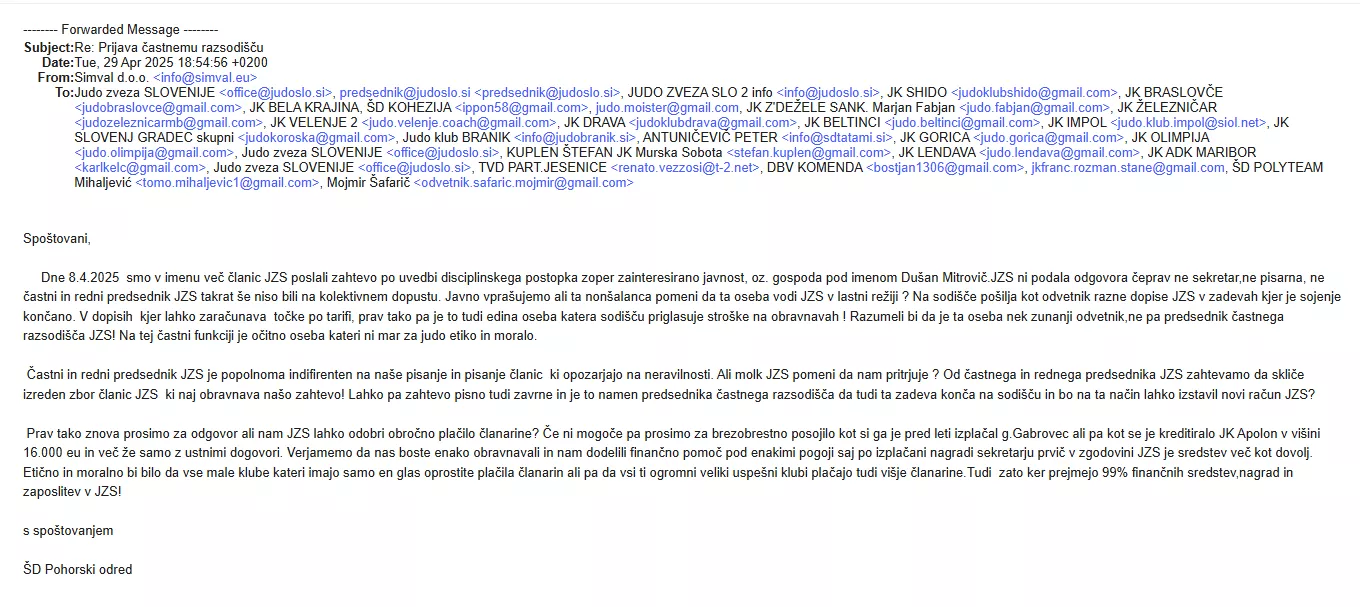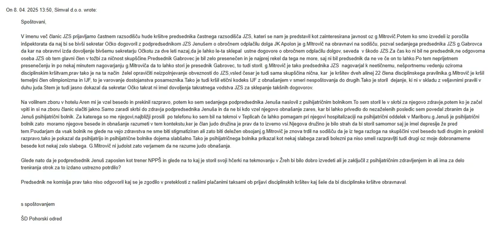 "Prav tako vam pošiljam elektronsko pošto, prijavo in vprašanje, ki sem ga kot predsednik ŠD Pohorski odred naslovil na JZS, v katerem sem prosil za enako posojilo, kot ga je po javno dostopnih informacijah v preteklosti prejel g. Gabrovec. O obstoju posojila JZS g. Gabrovcu smo bili klubi seznanjeni, saj so nekateri predstavniki začeli pošiljati vprašanja na to temo. Posojilo je bilo omogočeno tudi podpredsedniku JZS Mitji Jenušu, ki je dolg v višini 16.000 evrov do JZS – po neznanem ustnem dogovoru – obročno odplačeval. Gre za dogovor, za katerega ni vedel nihče, razkrit pa je bil šele pred kratkim na obravnavi na sodišču. Takrat je predsednik Gabrovec navedbe o dogovoru prvič slišal, nato pa ga je – po nagovoru odvetnika Mitroviča – retroaktivno potrdil, za obdobje, ko sploh še ni bil predsednik JZS."
