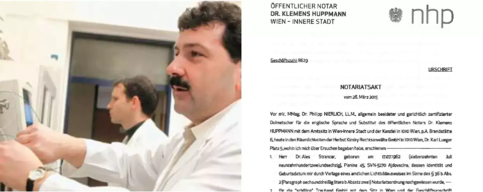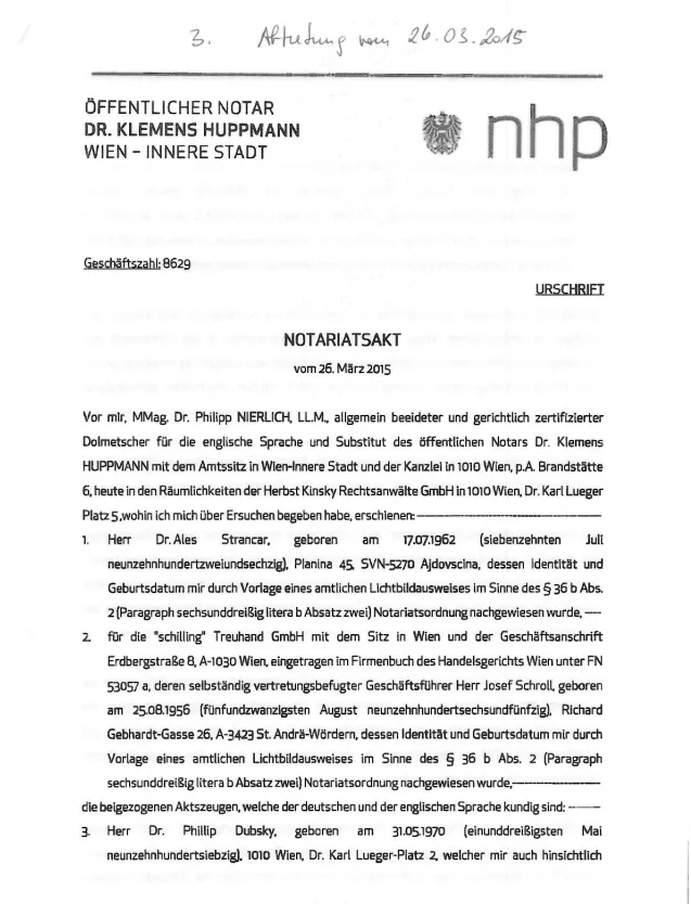 Pred menoj, MMag. dr. Philipp NIERLICH, LL.M., splošno zaprisežen in sodno certificiran tolmač za angleški jezik ter namestnik javnega notarja dr. Klemensa HUPPMANNA s sedežem v Dunaj-Notranje mesto in s pisarno na 1010 Dunaj, p.A. Brandstätte 6, danes v prostorih odvetniške družbe Herbst Kinsky Rechtsanwälte GmbH na 1010 Dunaj, Dr.-Karl-Lueger-Platz 5, kamor sem se na prošnjo zglasil, so se pojavili: