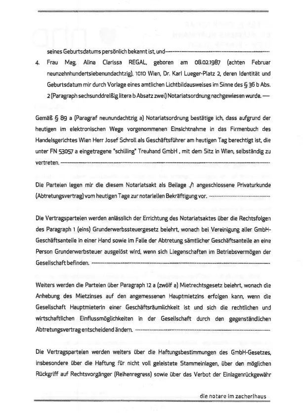 4. Gospa mag. Alina Clarissa REGAL, rojena 08.02.1987 (osmega februarja tisoč devetsto sedeminosemdeset), 1010 Dunaj, Dr. Karl Lueger-Platz 2, katere identiteta in datum rojstva sta bila meni dokazana z uradno osebno izkaznico s fotografijo v smislu § 36 Abs. 2 (paragraf šestintrideseti litera b odstavek drugi) Notariatsordnung – notarske uredbe. –