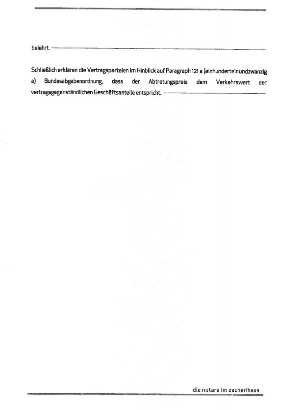 Nazadnje pogodbene stranke v zvezi s § 121 a (sto enaindvajset a) Zveznega zakona o davkih izjavijo, da odstopna cena ustreza tržni vrednosti poslovnih deležev, ki so predmet pogodbe.