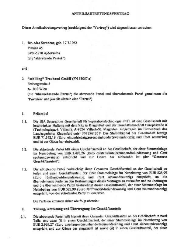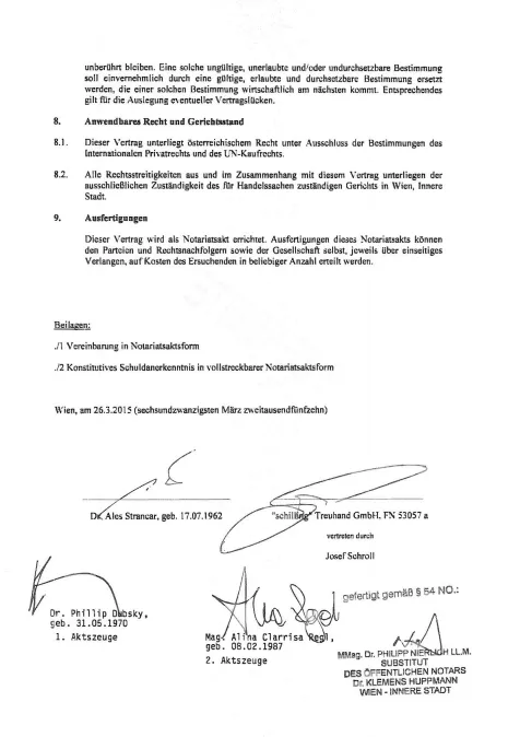 Že prej je slovenska javnost spoznala njegovo zgodbo, ko so ga hoteli uničiti s pomočjo Spirita, odvetniške pisarne Vladimira Zemljariča, sina pokojnega Janeza Zemljariča in EBRD. Tokrat vam bomo eksluzivno predstavili več avstrijskih dokumentov (notarske pogodbe, pogodbe o odtujitvi itd..). Ker ne moremo objaviti v vseh dokumentov v enem članku, jih bomo objavili v vsaki trilogiji nekaj na koncu članka. Kdor odlično zna brati dokumente v nemščini bo hitro ugotovil, da Aleš Štrancar ne laže.