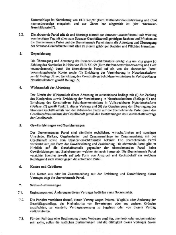 Prenos in odsvojitev Strancarjevega poslovnega deleža se izvrši ob (i) plačilu nominalne vrednosti v višini 523,99 EUR (evro petsto triindvajset in 99 centov) s strani prevzemne stranke na račun, ki ga mora odsvojitvena stranka sporočiti, ter (ii) sklenitvi dogovora v notarski obliki v skladu s prilogo /1 in sklenitvi konstitutivnega priznanja dolga v izvršljivi notarski obliki v skladu s prilogo /2.