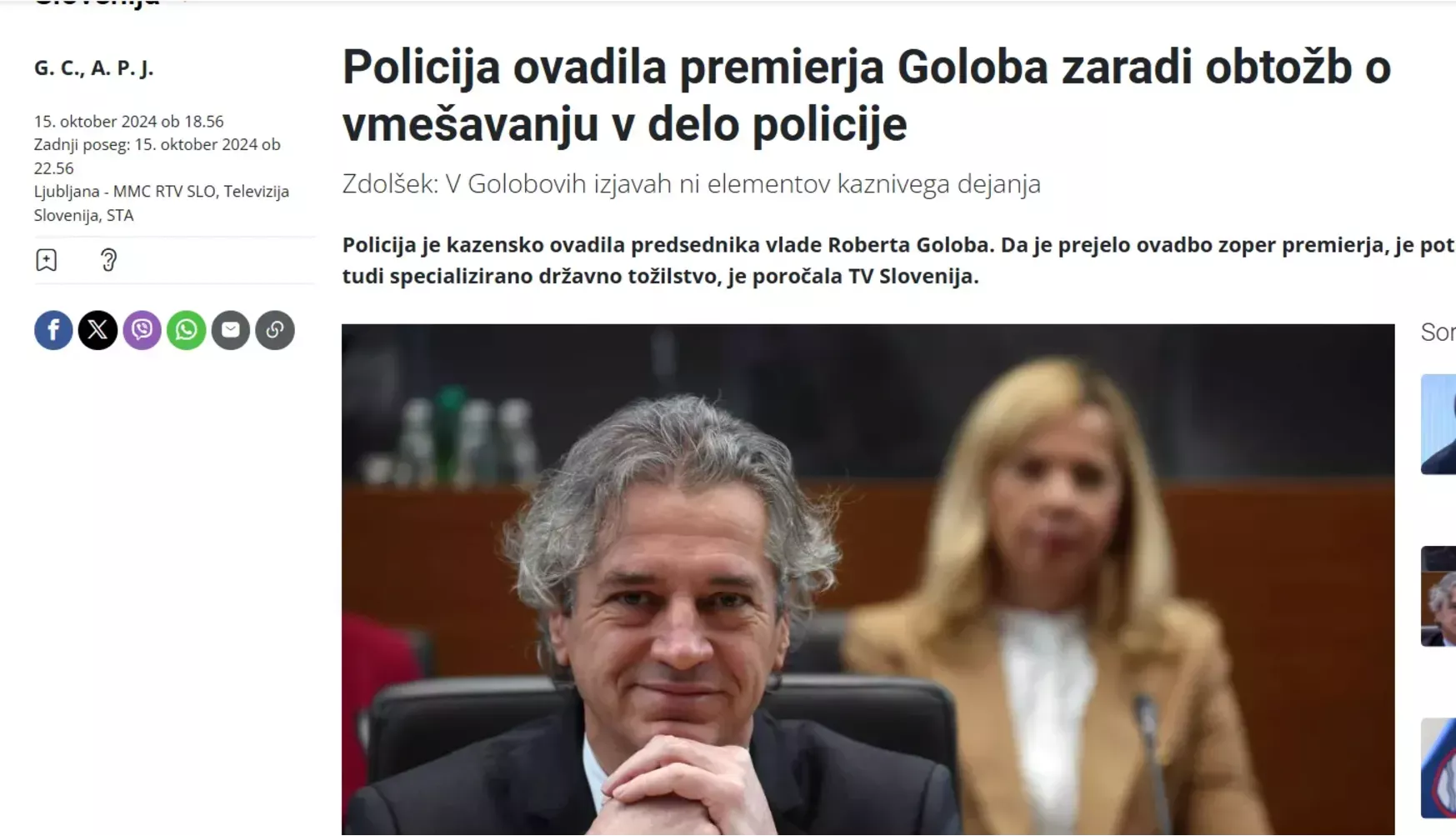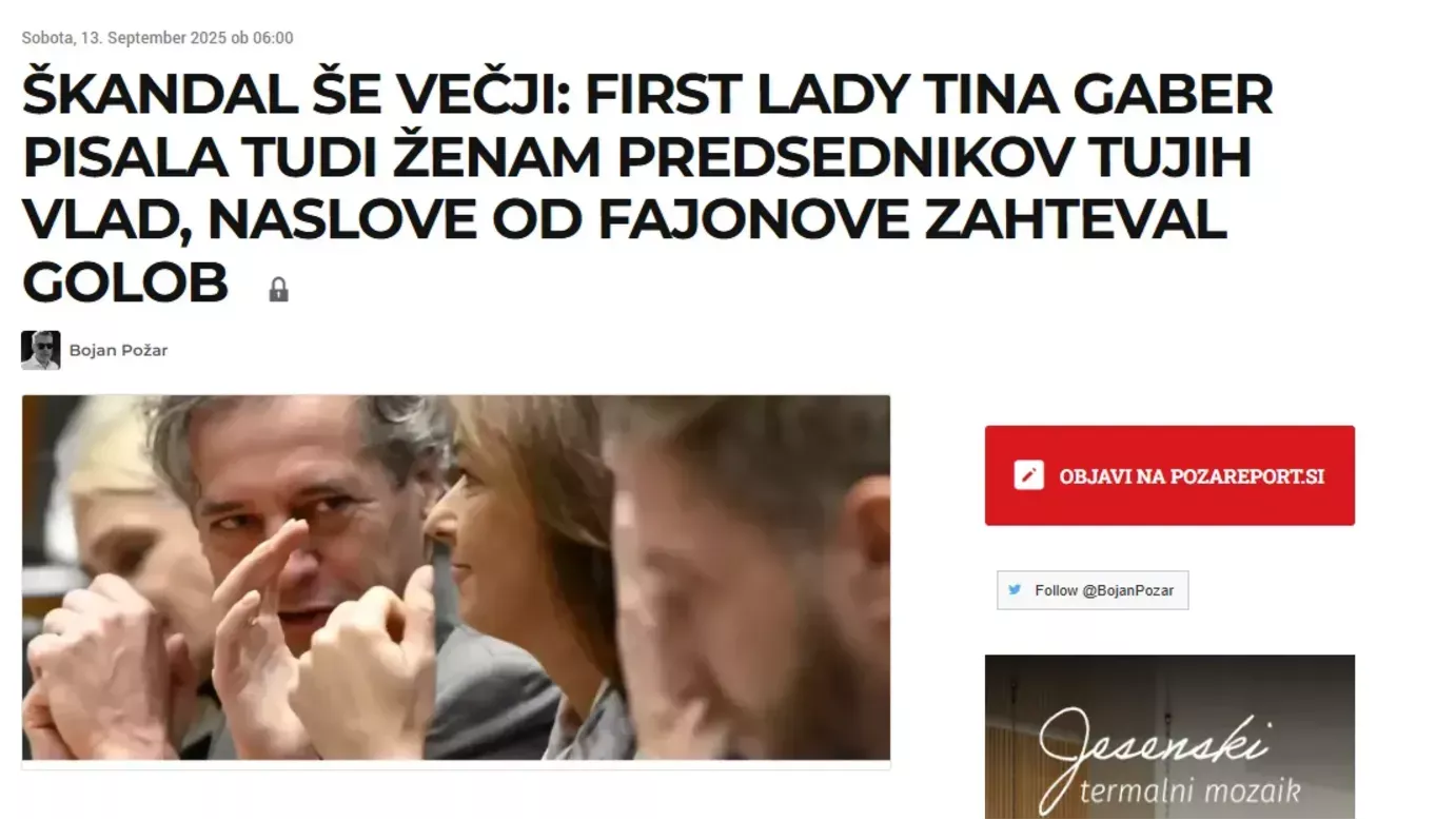 Bistveno pri vsem skupaj pa je, da zgodba ne bi bila mogoča brez neposrednega posredovanja Roberta Goloba. Kot je razkril dolgoletni raziskovalni novinar Bojan Požar, je že 4. avgusta njegov kabinet na ministrstvo za zunanje in evropske zadeve naslovil urgentno zahtevo za posredovanje kontaktov soprog tujih predsednikov vlad. Ministrstvo, ki ga vodi Tanja Fajon, je zahtevi v nekaj urah ugodilo. To pomeni, da je ministrica vedela, kaj se dogaja, in da je bila zahteva na ministrstvo prenesena s političnim pritiskom z vrha izvršne oblasti.