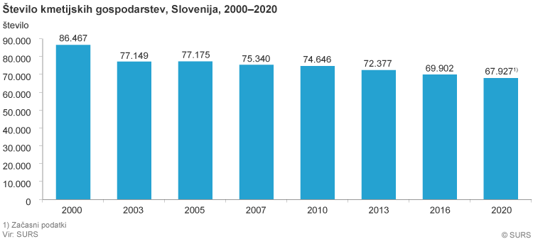 Število kmetijskih gospodarstev v Sloveniji se zmanjšuje že zadnjih dvajset let. Po začasnih podatkih iz Popisa kmetijstva 2020 imamo tako v Sloveniji 67.927 kmetijskih gospodarstev ali za 9 % manj kot leta 2010 (74.646) ter kar za 21 % manj kot leta 2000 (86.467). V dvajsetih letih se je torej pri nas zmanjšalo število kmetijskih gospodarstev za skoraj 20.000.