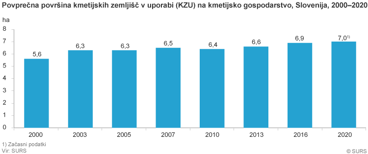 Po drugi strani pa je povprečno kmetijsko gospodarstvo večje kot pred desetletjem. V letu 2020 je po začasnih podatkih imelo v uporabi 7 ha kmetijskih zemljišč (skupni pašniki niso vključeni) in redilo 6 glav velike živine (GVŽ). Povprečna površina kmetijskih zemljišč v uporabi (KZU) je bila za 0,6 ha večja kot pred desetimi leti in za 1,4 ha večja kot pred dvajsetimi leti. Povprečno število GVŽ pa je bilo za 0,4 večje kot pred desetimi in za 0,6 večje kot pred dvajsetimi leti.