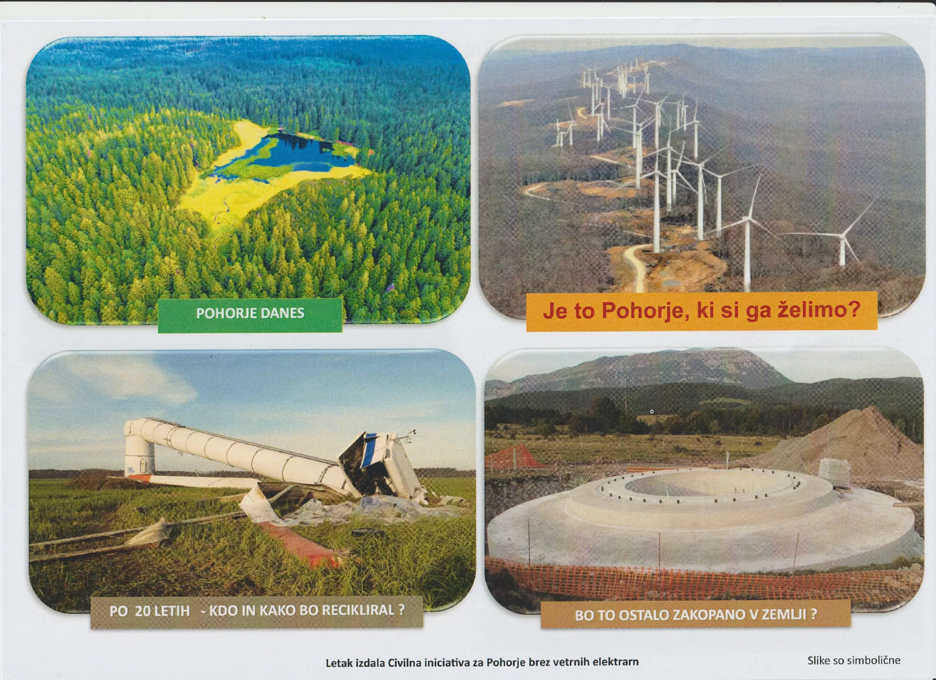 Civilna iniciativa Za Pohorje brez vetrnih elektrarn nasprotuje projektu družbe Energija na veter, ki namerava zgraditi kar 56. vetrnih elektrarn in sporoča: "Tace stran od Pohorja"!