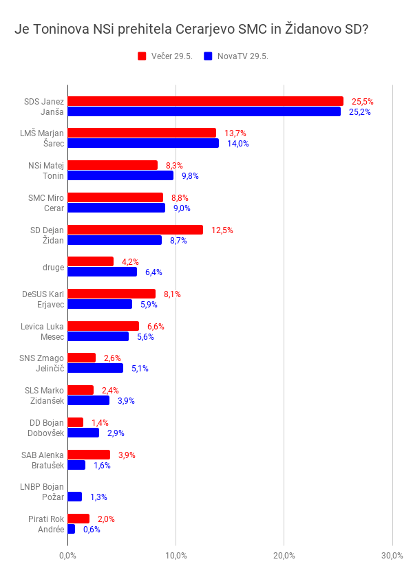 Nenaden vzpon NSI Mateja Tonina je presenečenje dveh meritev javnega mnenja, katerih rezultati so bili objavljeni včeraj, ko so čez dan že potekala prva glasovanja na predčasnih voliščih. Po meritvi Ninamedie, ki jo je objavil Večer, je NSi prehitela Levico Luke Meseca in Desus Karla Erjavca. Po raziskavi Parsifala SC za Novo24TV pa tudi SMC Mira Cerarja in SD Dejana Židana. NSi se je tam prebila celo na tretje mesto. Po obeh raziskavah je na vrhu precej daleč pred drugimi SDS Janeza Janše, s skoraj pol manjšim deležem sledi LMŠ Marjana Šarca.