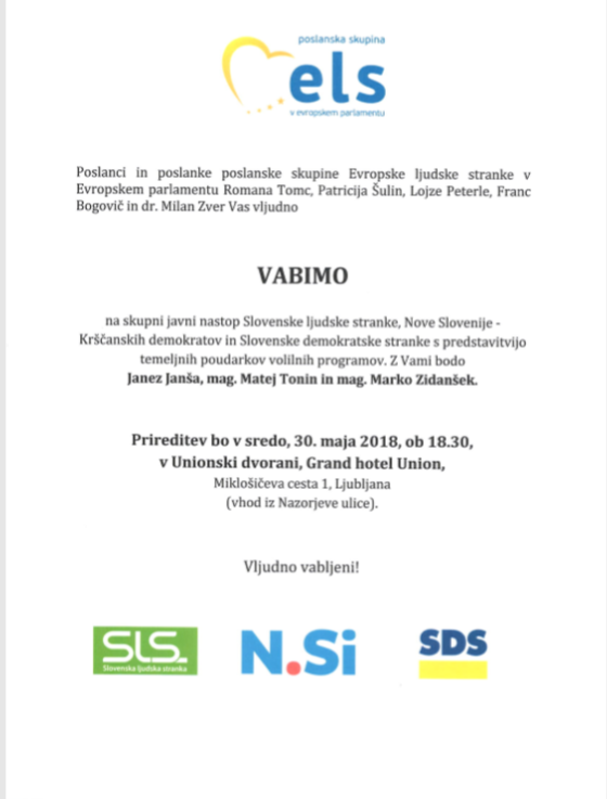 Vabimo vas na skupni nastop pomladnih strank, ki bo v sredo, 30. maja 2018 ob 18.30 v Unionski dvorani Grand hotela Union.