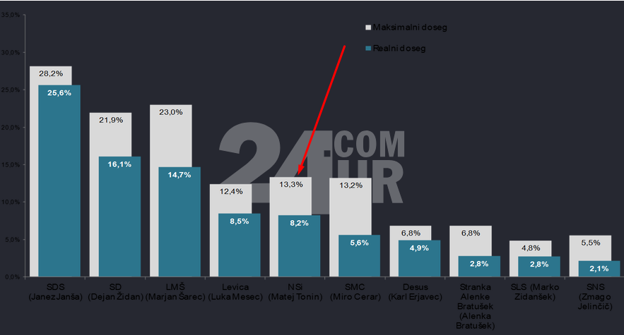 Razlike med realnim in maksimalnim dosegom in rast neodločenih volivcev pritrjujejo tezi, da se v zadnjih dneh kampanje lahko zgodijo še marsikatera presenečenja. Trenutno tako po realnem kot maksimalnem dosegu vodi SDS, sledita ji SD in LMŠ, ki ima največjo razliko med realnim in maksimalnim dosegom. A bolj kot boj za prva tri mesta bo očitno pomemben boj v drugi polovici lestvice, saj bodo to stranke, ki bodo odločale o sestavi naslednje koalicije in vlade.