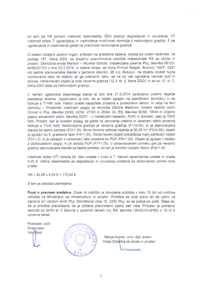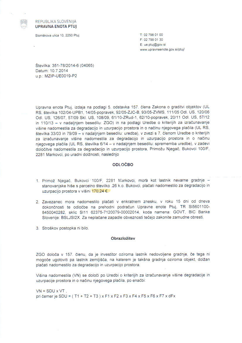 Danes sem prejel odločbo, po kateri moram plačati 170,24 € kazni.