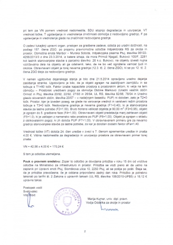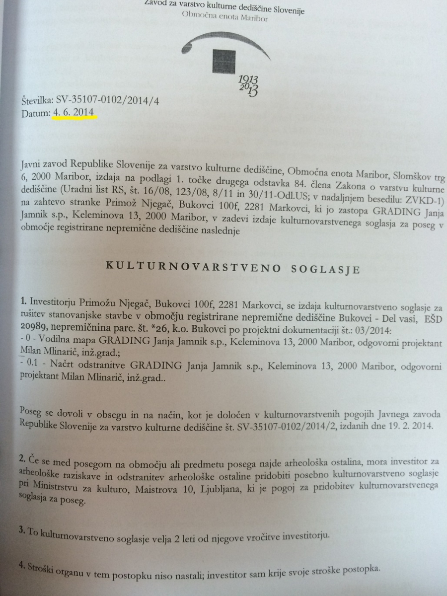 Na podlagi ugotovitve inšpektorja, da gre za "nevarno gradnjo" sem 4.6.2014 končno uspeli pridobiti kulturnovarstveno soglasje za poseg na tej "nevarni gradnji". Na podlagi tega sem zdaj lahko sprožil postopek pridobivanja grabenega dovoljenja za rušitev objekta.