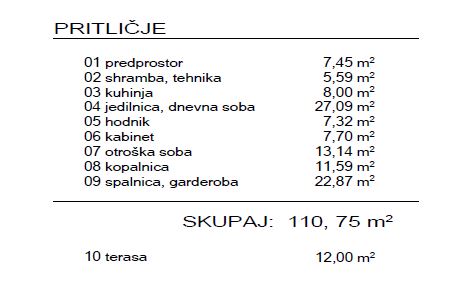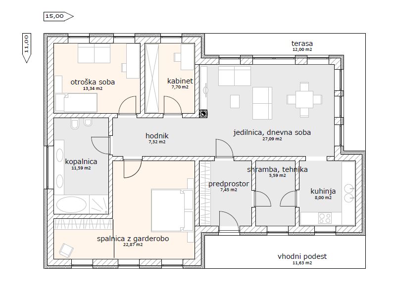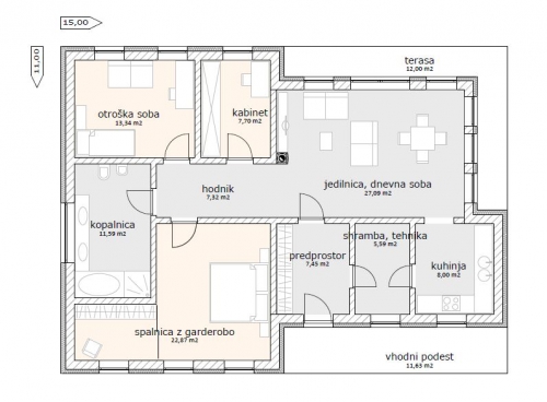 Hiša Eliza je zasnovana kot moderna pritlična hiša z ravno streho. Dnevno bivalni prostori imajo višjo svetlo višino prostora kot spalni del objekta. Hiša je zasnovana tako, da odgovarja sodobnemu načinu življenja. Predprostor je prostoren in omogoča dovolj odlagalne površine. Tehnika je združena s shrambo in omogoča prehod v kuhinjo. Kuhinja je zasnovana kot ločen prostor, pa vendar povezana z dnevno bivalnim prostorom, ki zajema jedilnico z dnevno sobo s kaminom. Hodnik je zasnovan kot povezovalni element med dnevnim delom objekta in spalnim delom, ki zajema kabinet, spalnico z garderobo, otroško sobo in kopalnico. Neto tlorisna površina objekta znaša 110,75 m2 + terasa 12,00 m2.