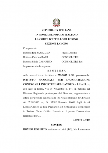 Vse znanstvene elemente tega primera sta ponovno pregledala in ponovno analizirala dva nova strokovnjaka, ki jih je imenovalo sodišče v Torinu (Carolina Marino, Angelo D'Errico). Prizivno sodišče je v celoti sprejelo njune sklepe in zavrnilo pritožbo INAIL *, pri čemer je trdilo, da sta strokovnjaka, določena od sodišča, zagotovila: