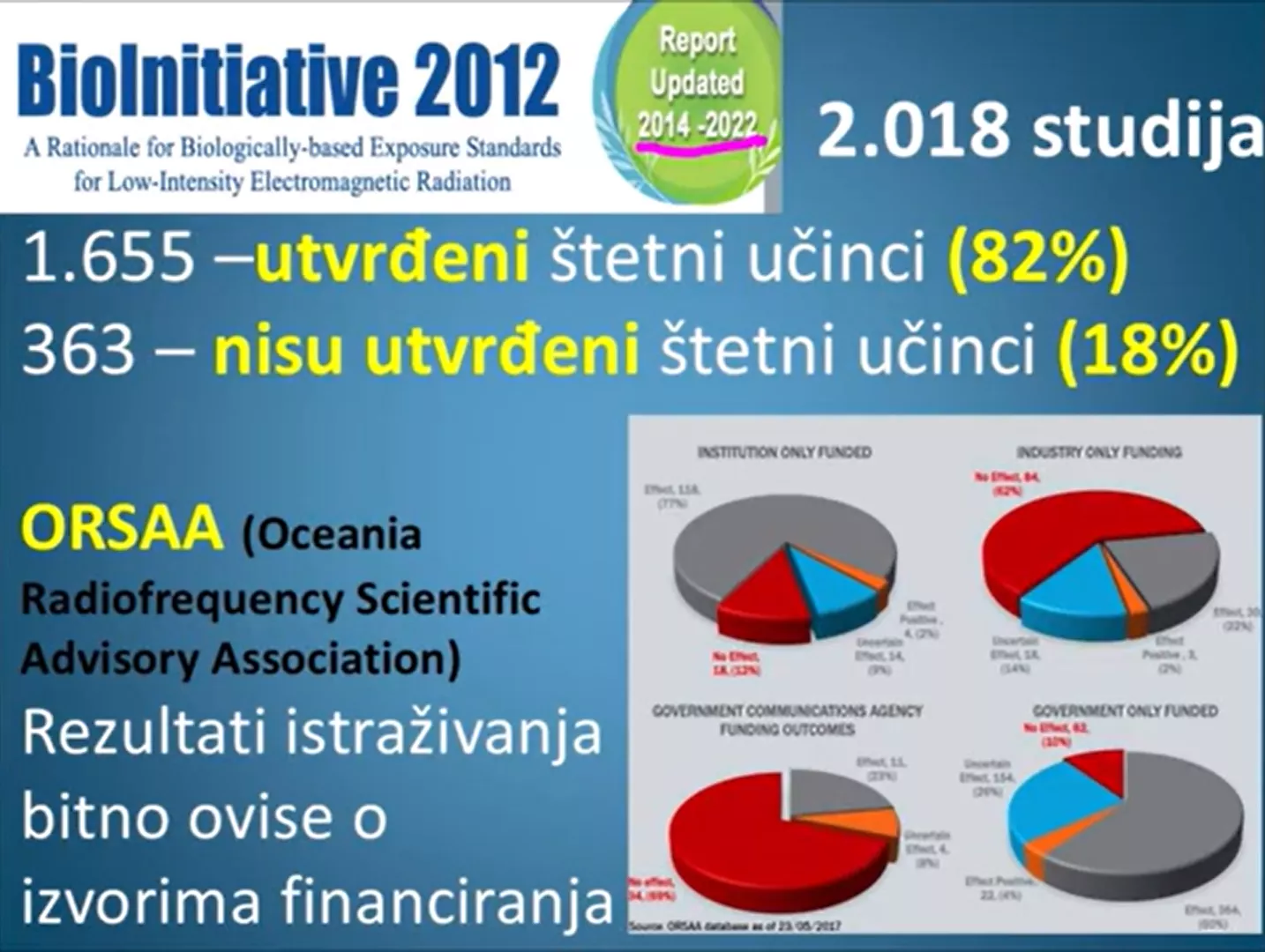 V osmih letih od objave poročila BioInitiative 2012 je bilo izvedenih precejšnje število novih raziskav. Velika večina študij poroča o bioloških učinkih radiofrekvenčnega sevanja v nasprotju z „brez učinka“. Trend še naprej kaže, da izpostavljenost nizkointenzivnim ELF-EMF / statičnim poljem in radiofrekvenčnim sevanjem (RFR) na ravneh, dovoljenih v skladu z veljavnimi zveznimi mejami javne varnosti, predstavlja zdravstveno tveganje. Posodobljene datoteke v oddelku Povzetek raziskav podrobno opisujejo število študij, ki kažejo "učinek in brez učinka" za proste radikale (oksidativna škoda), študije kometnih testov, genetske in nevrološke študije ter elektro preobčutljivost. Tu je povzetek novih rezultatov za leto 2020 (14) - podrobnosti so na strani https://bioinitiative.org/research-summaries/