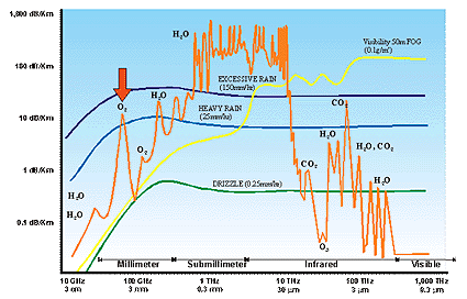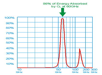 Slika 1: Absorbcija na kilometer v suhi atmosferi. Slika prikazuje absorpcijo milimetrskih valovnih frekvenc v atmosferi. Pri milimetrski valovni frekvenci 60GHz je absorpcija zelo visoka, 98 % oddane energije absorbira atmosferski kisik. Čeprav absorpcija kisika pri 60GHz močno omejuje območje, odpravlja tudi motnje med istimi frekvenčnimi terminali.