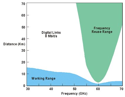 Prednost absorpcije kisika glede na ponovno uporabo frekvence je podrobno prikazana na sliki 2, ki prikazuje razmerje med razdaljo in med območjem ponovne uporabe frekvence 60GHz (zeleno območje) in tradicionalnim razponom (modro območje). Absorpcija kisika omogoča ponovno uporabo iste frekvence v zelo lokaliziranem območju zračnega prostora. Delovanje znotraj 60GHz milimetrskega valovnega spektra omogoča zelo zgoščeno uporabo istih frekvenčnih radijskih terminalov brez motenj.