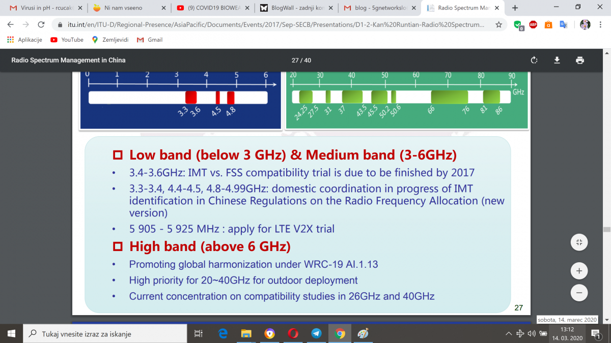 Kitajsko omrežje 5G v okolju ne deluje na 60GHz, ampak za zdaj večinoma do 6 GHz. Verjetno pa imajo znotraj stavb WiGig na 60GHz?? Na vsak način je napačna domneva, da 5G povzroča virus. Na FB v teh dneh krožijo dezinformacije, da je koronavirus COVID-19 posledica zastrupljenih celic zaradi omrežja 5G in da naše celice proizvajajo te koronaviruse. Zato zdaj v Veliki Britaniji zažigajo stolpe mobilne telefonije :