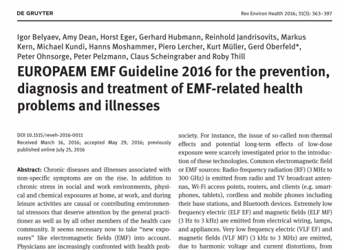 Smernice EUROPAEM EMF (35 strani) :Igor Belyaev, Amy Dean, Horst Eger, Gerhard Hubmann, Reinhold Jandrisovits, Markus Kern, Michael Kundi, Hanns Moshammer, Piero Lercher, Kurt Müller, Gerd Oberfeld*, Peter Ohnsorge, Peter Pelzmann, Claus Scheingraber and Roby Thill EUROPAEM EMF Guideline 2016 for the prevention, diagnosis and treatment of EMF-related health problems and illnesses https://www.degruyter.com/downloadpdf/j/reveh.2016.31.issue-3/reveh-2016-0011/reveh-2016-0011.pdf