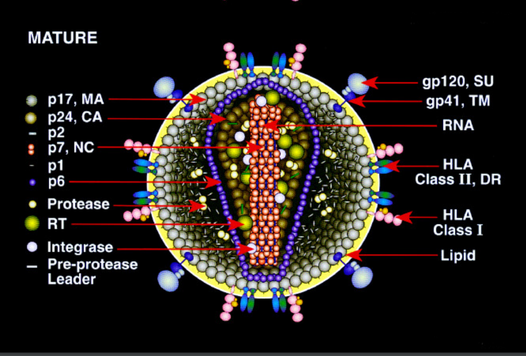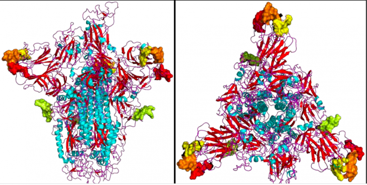 Slika prikazuje S protein koronavirusa SARS CoV-2/COVID-19 - tri konice obarvane rumeno, oranžno in rdeče so enake kot pri retrovirusu HIV in s temi konicami se veže na receptor ACE2 v membrani človeških celic. ( op. prev: največ ACE2 receptorjev imajo epitelne celice v pljučih, zato virus najbolj prizadene pljuča). Brez teh segmentov S proteina, koronavirus SARS CoV-2/COVID-19 ne bi bil patogen za ljudi