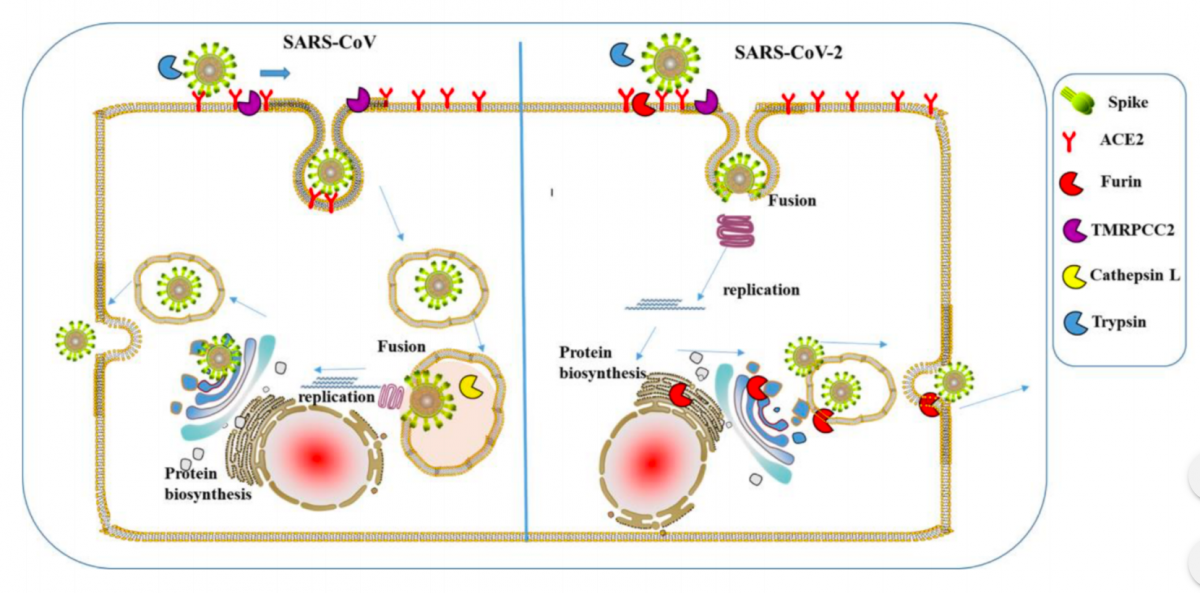 Diagram vstopa v celico koronavirusa SARS CoV in novega koronavirusa COVID-19 (SARS-CoV2 ali 2019 nCoV). Encimi proteaze so prikazani v različnih barvah. Encim furin lahko razcepi beljakovinsko strukturo med procesom dozorevanja COVID-19 virusa in s tem aktivira ta virus