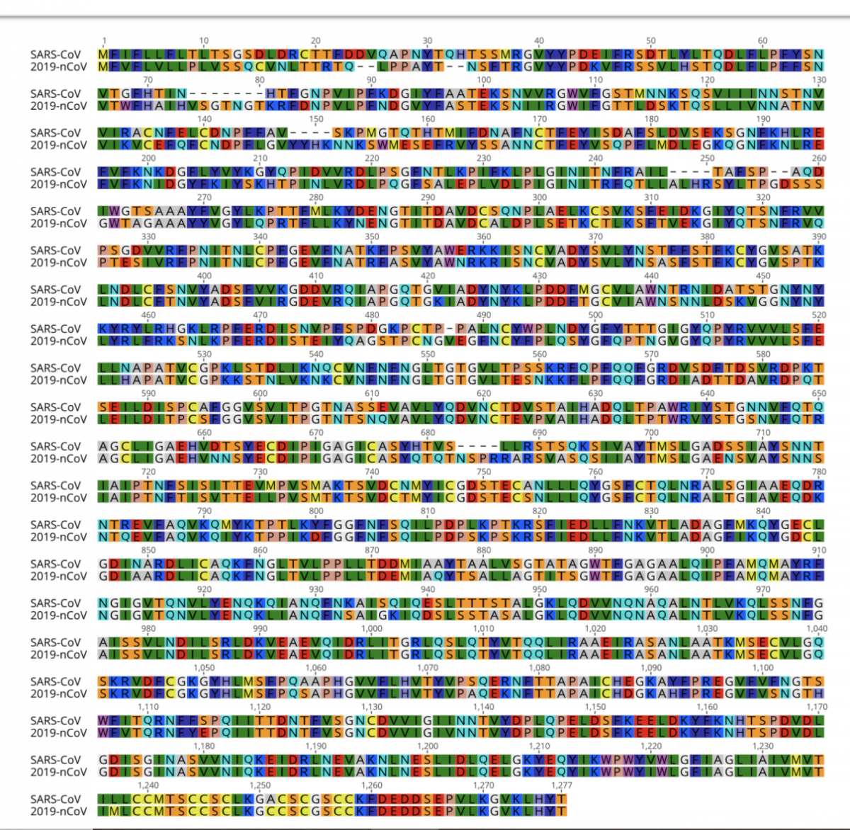 genetsko zaporedje koronavirusa SARS CoV-2 (ime virusa je 2019 nCoV, bolezen, ki jo povzroča pa se imenuje COVID-19) ; 4 gene ima enake kot retrovirus HIV- slika prikazuje veliko podobnost genov s SARS Cov koronavirusom (80% podobnost), virus je velik 0,1 mikrona, sodi med enoverižne RNA viruse, ki mutirajo 100 krat hitreje od DNK virusov