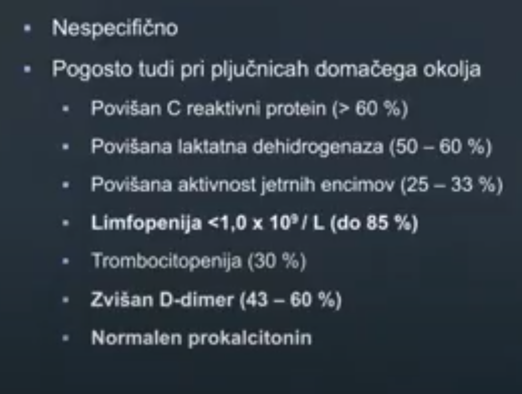 V raziskavi z 41-imi bolniki s covidom-19 (13 s hudo boleznijo) so bili pomembni napovedni dejavniki sprejema na oddelek za intenzivno nego: zvišano število belih krvničk levkocitov in zmanjšanje števila limfocitov ter D-dimera (razgradnega produkta fibrina) kot pokazatelj prisotnosti tromboz. Pri četrtini bolnikov, sprejetih na intenzivno enoto, so bili povišani jetrni encimi in prokalcitonin (povišan pri pridruženi bakterijski okužbi). Podobna slika se lahko kaže še mesece po bolezni tudi pri tistih, ki so preboleli lažjo obliko.