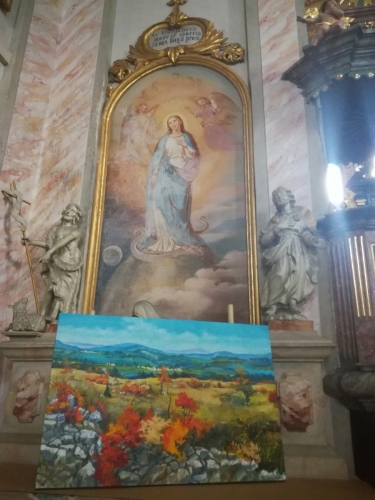 Danes sem obiskala razstavo slik v cerkvi Sv. Trojica na Vrhniki, ki je po navadi zaprta. Zato me veseli, da je cerkev ta teden odprta za obiskovalce in sem si jo lahko ogledala tudi od znotraj in ne kot po navadi le od zunaj, ko se sprehajam po številnih stezicah na tem hribu. Cerkev Sv. Trojice je zelo lepo poslikana in ohranjena. Ob oltarju sta čudoviti freski Jezusovega Krsta v reki Jordan ter prizora Transfiguracije na gori Tabor.