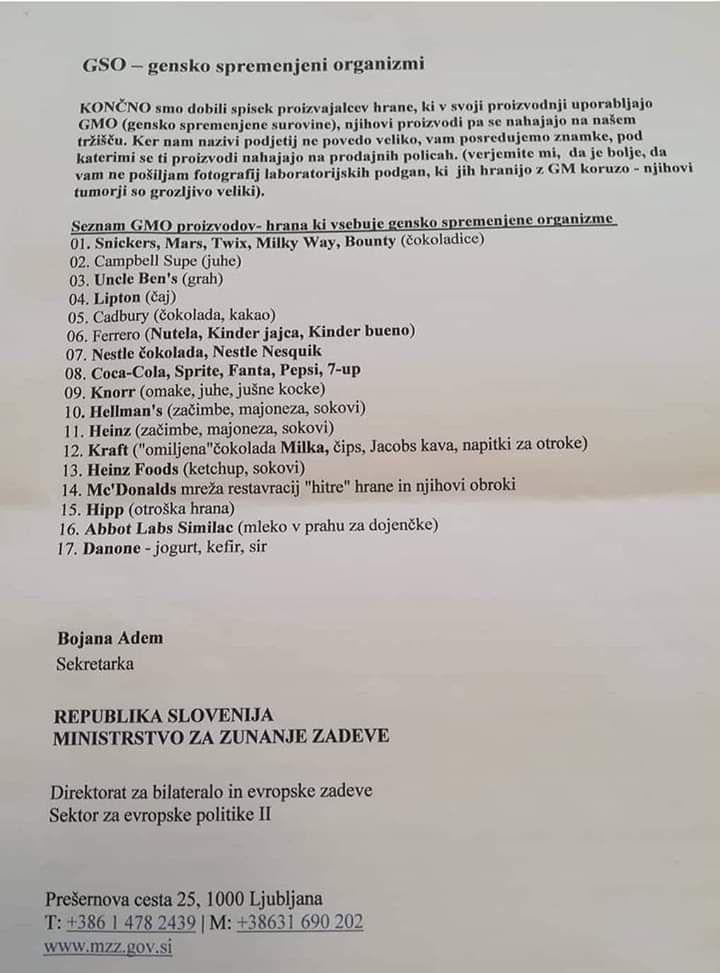 V Sloveniji prodaja GSO hrane ni dovoljena, navzoča pa je GSO soja v krmi. Več o tem : https://www.ostro.si/si/razkrinkavanje/objave/nekdanja-sekretarka-seznam-zivil-z-gso-posiljala-kot-zanimivost