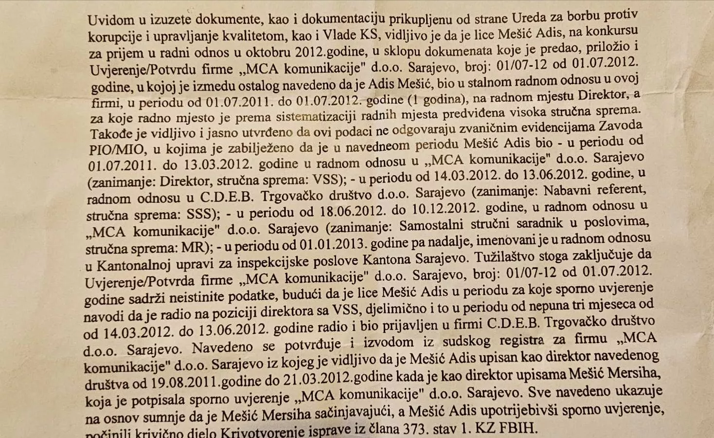 Stoga su na potezu bile druge institucije i pravosuđe. A djelovanjem tih institucija ustanovljeno je da je Adis Mešić počinio krivično djelo “Krivotvorenje isprave”, po članu 373. stav 1 Krivičnog zakona FBiH. Naime, Tužilaštvo Kantona Sarajevo po prijavi Ureda za borbu protiv korupcije ustanovilo je da je Adis Mešić na konkurs za prijem u radni odnos u Kantonalnoj upravi za inspekcijske poslove (KUIP) dostavio potvrdu firme “MCA komunikacije” Sarajevo o stalnom radnom odnosu u firmi u trajanju od jedne godine na poziciji direktora. Istražnim radnjama potom je ustanovljeno da podaci iz potvrde nisu tačni.