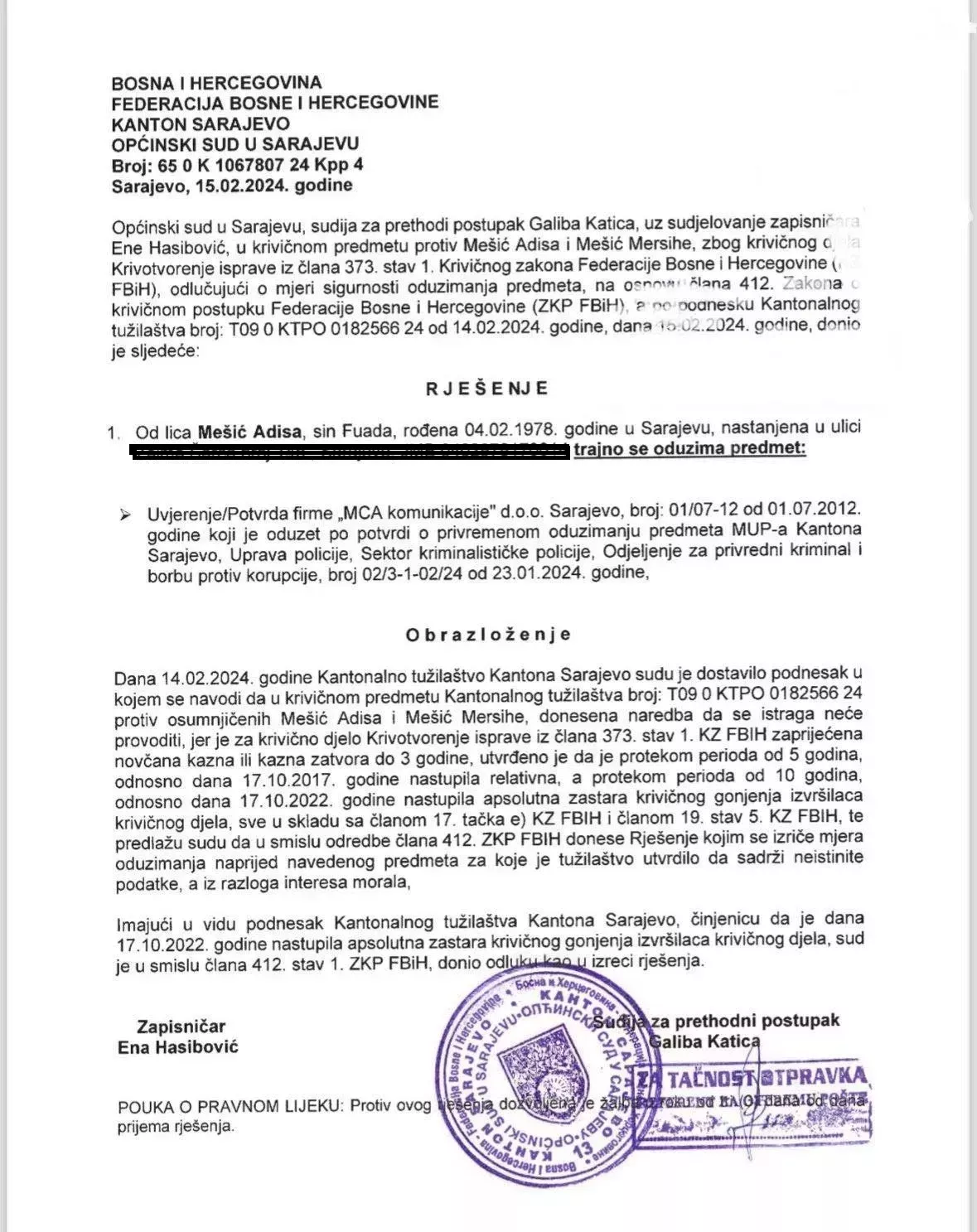 Općinski sud u Sarajevu postupio je po zahtjevu Tužilaštva KS i 15. februara TRAJNO Adisu Mešiću oduzeo krivotvorenu potvrdu.